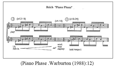 درواقع در این روش یک الگوی ملودی با تأخیر زمانی نسبت به الگوی اولیه ادامه میدهد، در این شرایط دو ملودی در یک نقاطی از هم فاصله میگیرند سپس در یک نقاط به هم میرسند و به شکل همصدا نواخته میشوند و دوباره از هم فاصله میگیرند. همین روش کار منجر به بیان ایده اصلی رایش در موسیقی مینیمال به نام «موسیقی به مثابه یک فرآیند تدریجی» (۲۴) میشود. این تکنیک در قطعه «پیانو فاز» (۲۵) بهخوبی دیده میشود.