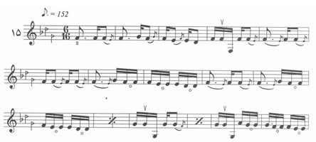 در این چهارمضراب ۱۲۳ میزانی (۱۷) که کوک و شاهد غیر مرسومی هم دارد، جملهی پایه از ابتدا واضح نیست. همان طور که در (شکل ۵) مشخص است چهار مضراب با طرحی شروع میشود که در ۴ میزان نخست به نظر میرسد یک پایهی کوتاه و سریع باشد، اما چنین نیست؛ جملهای که میتوان آن را پایه دانست از میزان ۷ به بعد به طور شاخص خود را نشان میدهد.