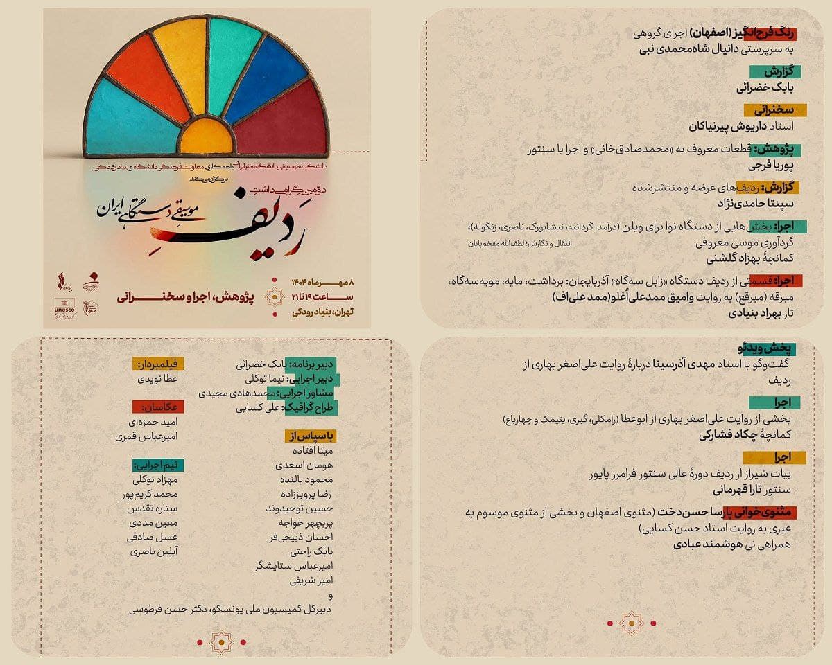 همچنین ارائه گزارش سپنتا حامدینژاد درباره ردیفهای عرضه و منتشرشده ایرانی، سخنرانی بابک خضرایی و داریوش پیرنیاکان دیگر بخشهای این مراسم است.