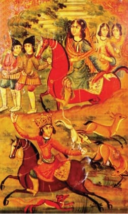 ۱. سید کریم، آینه منقوش (اوایل قرن هجدهم میلادی). روغن روی چوب، ۴۱/۲ × ۶۳ × ۵/۵ سانتی‌متر. باکو، موزه ملی هنر آذربایجان، П-۱۱۵۰/۵۳۴. —۱ الف. جزئیاتی از بخش پایین سمت چپ، صحنۀ شکار گورخر توسط بهرام گور به همراه فتنه، برگرفته از «هفت گنبد» (هفت پیکر) نظامی.